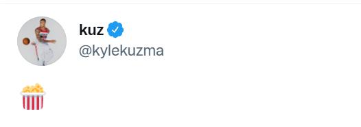 而前湖人球员,现奇才球员凯尔-库兹马,则在这时发推更新了一个吃爆米花的表情“看戏”。