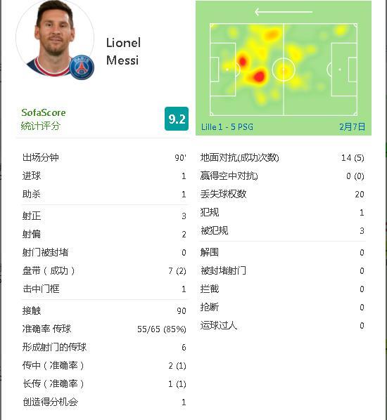 北京时间周一凌晨,巴黎在法甲比赛中5比1大胜里尔,比赛中打入1球的梅西获得了评分网站SOFASCORE送上的全场最高分9.2分。